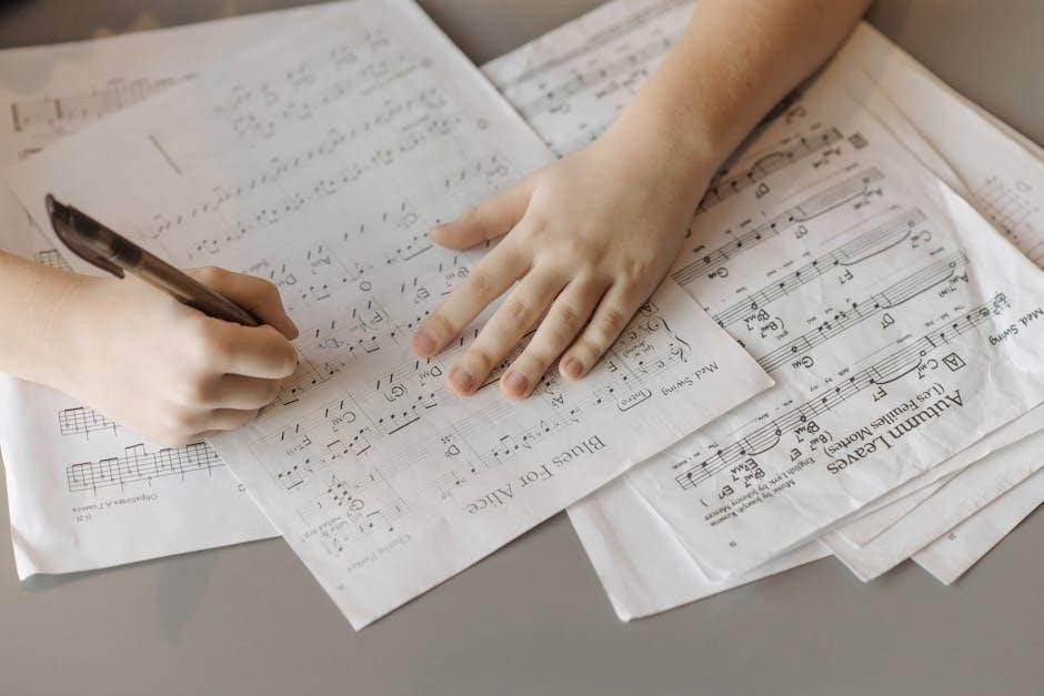 Rhythm and tempo are essential elements in music, defining its flow and feel. Rhythm is created by the arrangement of notes and rests, while tempo refers to the speed at which music is played. Common tempo markings include Largo (slow) and Presto (very fast). Time signatures, such as 4/4, indicate how many beats are in a measure. The Music Theory for Dummies PDF explains these concepts clearly, helping beginners understand how rhythm and tempo contribute to a piece’s mood and structure. Mastering these basics enhances your ability to play, compose, or simply appreciate music with greater depth and accuracy.